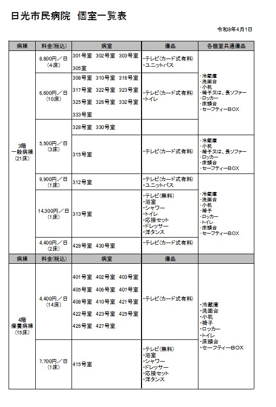 患者様およびご家族様へこのたび物価高騰による光熱費や設備維持費の上昇に伴い、令和8年4月1日より個室料金の見直しを以下のとおり行うことといたしましたので、ご理解の程よろしくお願いいたします。